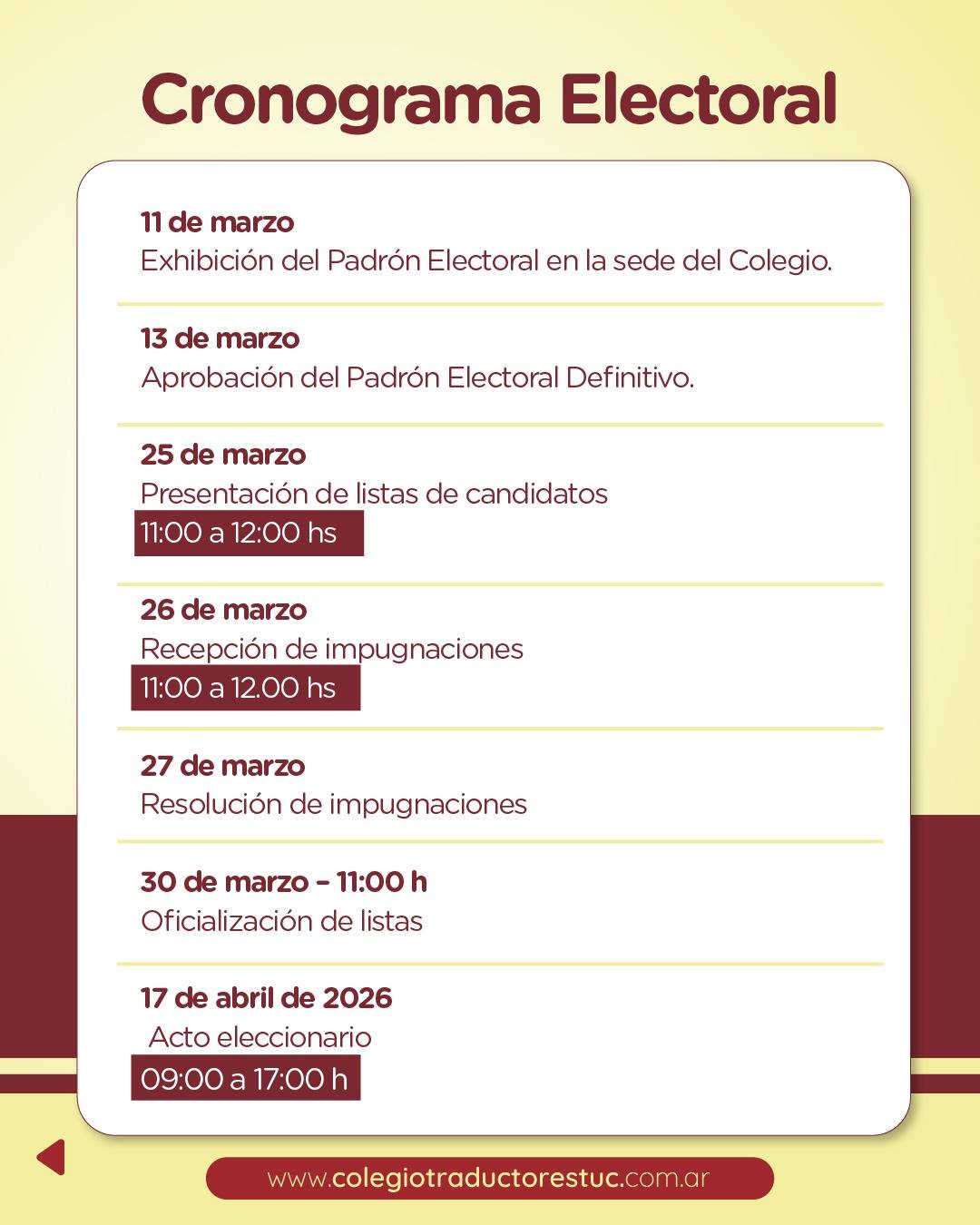 La jornada electoral se realizará el martes 17 de abril de 2026, en el horario de 09:00 a 17:00 horas, en la sede del Colegio, ubicada en Av. 24 de Septiembre 1021, 1° piso, Oficina 1, San Miguel de Tucumán.