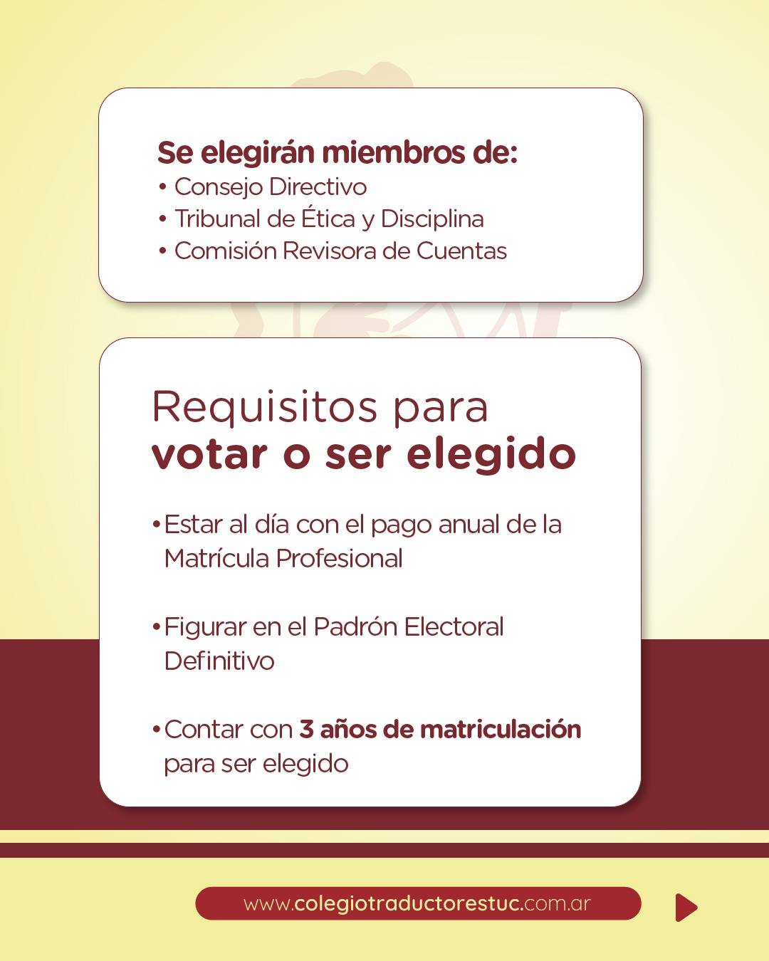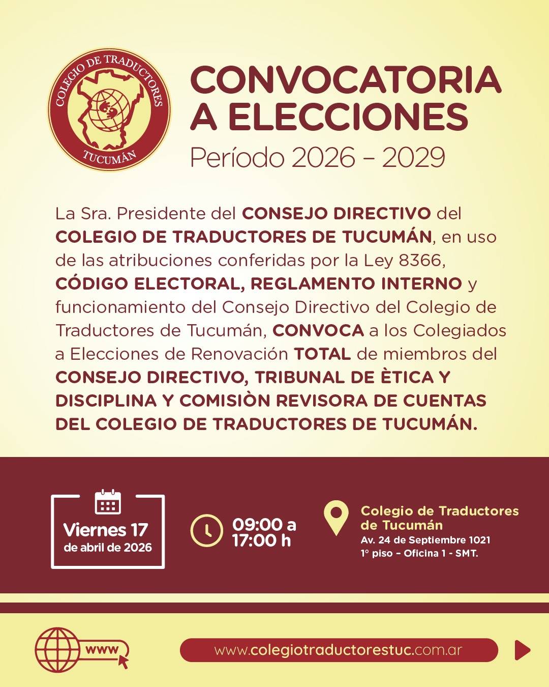 El Colegio de Traductores de Tucumán informa a sus colegiados que se ha realizado la convocatoria oficial a elecciones para el período 2026–2029, con el objetivo de renovar la conducción institucional.
